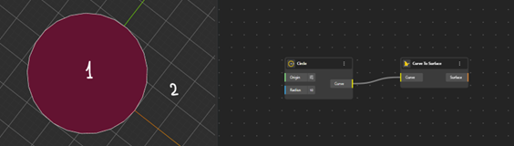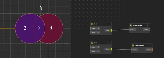 - 단계: 서피스스필릿(Surface Split)을 이용해 각 원을 다른 파티션로 나누기 (예; 원 A의 교 차 영역을 구분하고 싶면 원 B와 C를 Curve 노드블록의 Input에 연결하고 원A를 Surface 노드블록에 연결)원 B와 C에 대해서도 동일한 방법을 반복하여 고유한 교차 영역을 확보하기