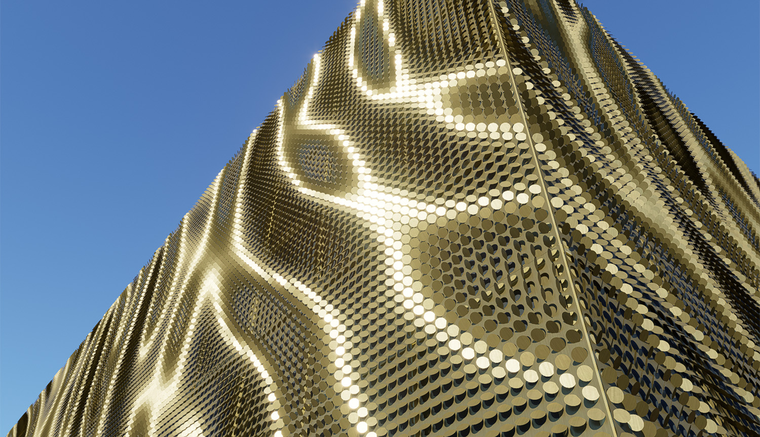 The building features rectangular panels, with laser cut circular discs. Each of these circular discs are of the same size and arranged in a rectangular Grid. These discs are uniquely angled to represent the input image in the Configurator. We parametrized the Angle of the disc based on the color gradation of the image. This design also creates a dynamic play of light and shadows, as sunlight shifts throughout the day creating an illusion of movement and a vibrant sense of energy!