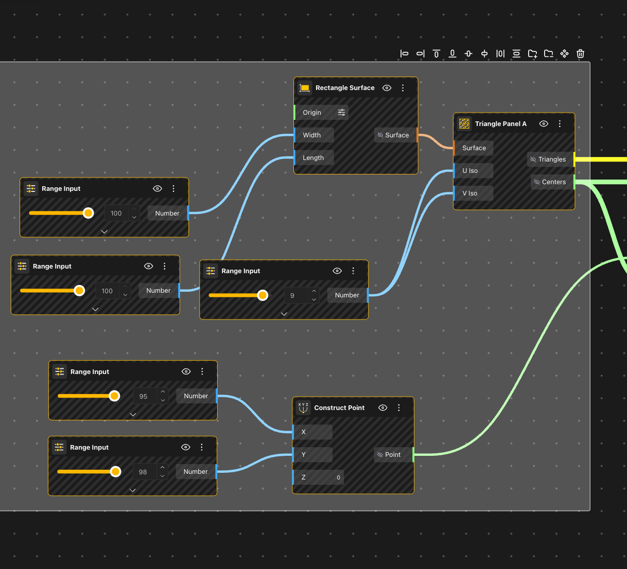 - Use a Triangular Panel node and connect the rectangle’s surface output to it. This divides your surface into triangular panels that will be affected by the attractor logic later.