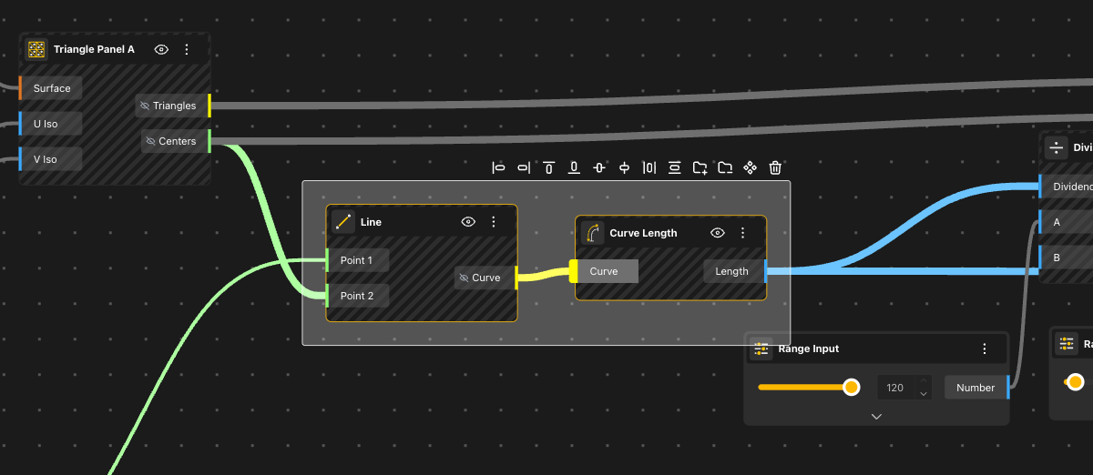 - Use a Curve Length node to measure the distance between the attractor point and each triangle’s center.