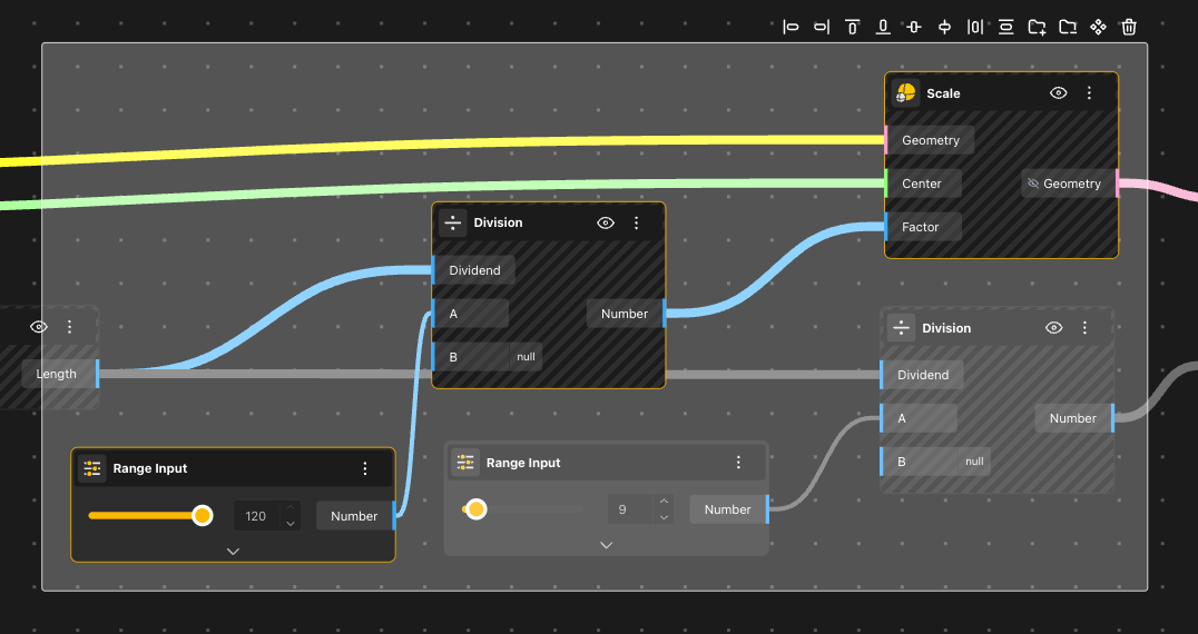 - Connect two Range Input nodes to the Width and Length inputs of the rectangle to control its size.