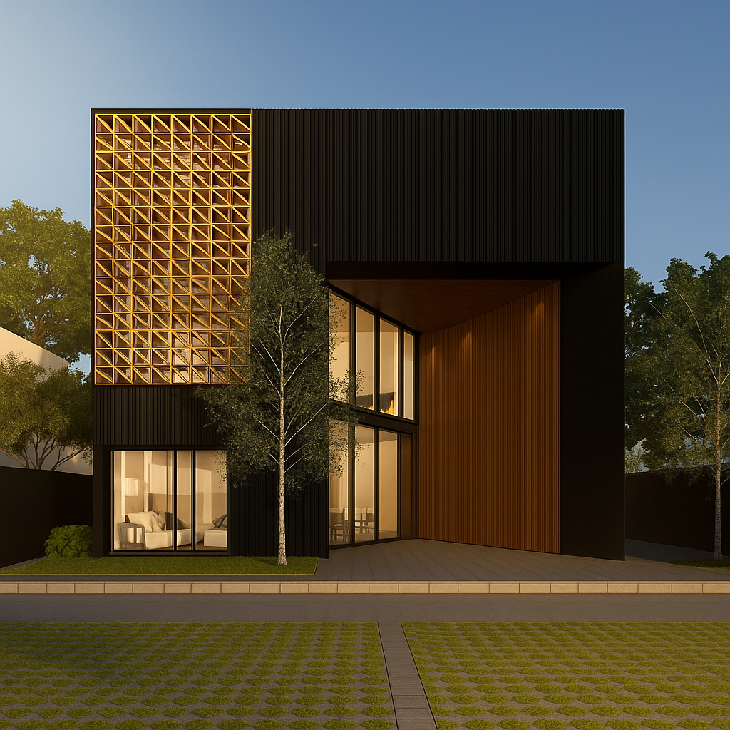 A bronze-like metallic material was chosen for the final finish. This choice emphasizes reflectivity and light interaction, achieved through Nano Banana AI by Gemini. The color palette and texture draw inspiration from oxidized metal surfaces often found in architectural cladding, balancing digital precision and material realism.
