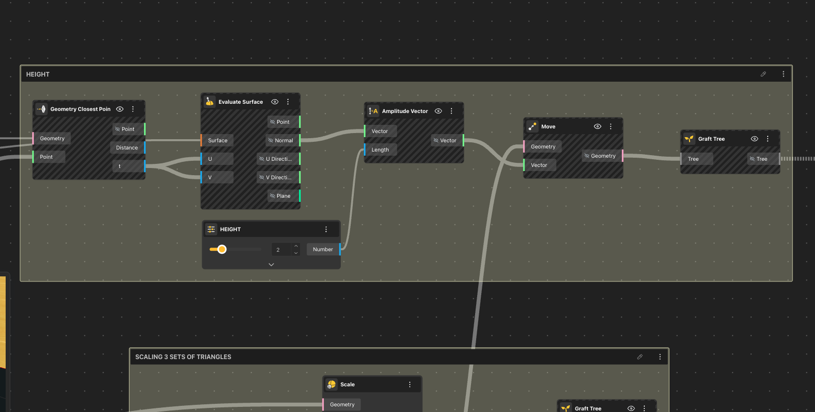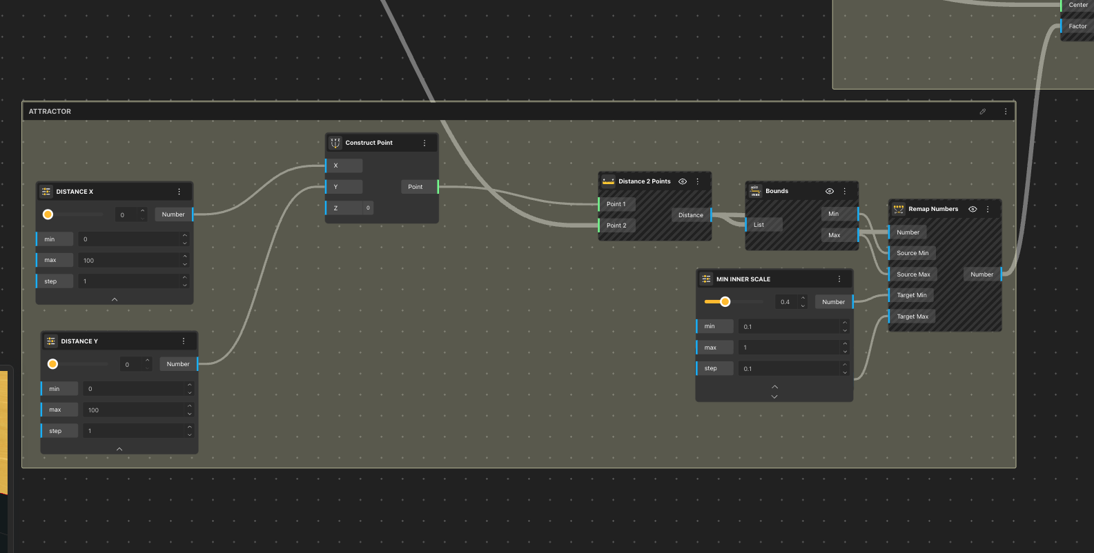 - These values were combined using the Construct Point node to create a movable attractor point in space.