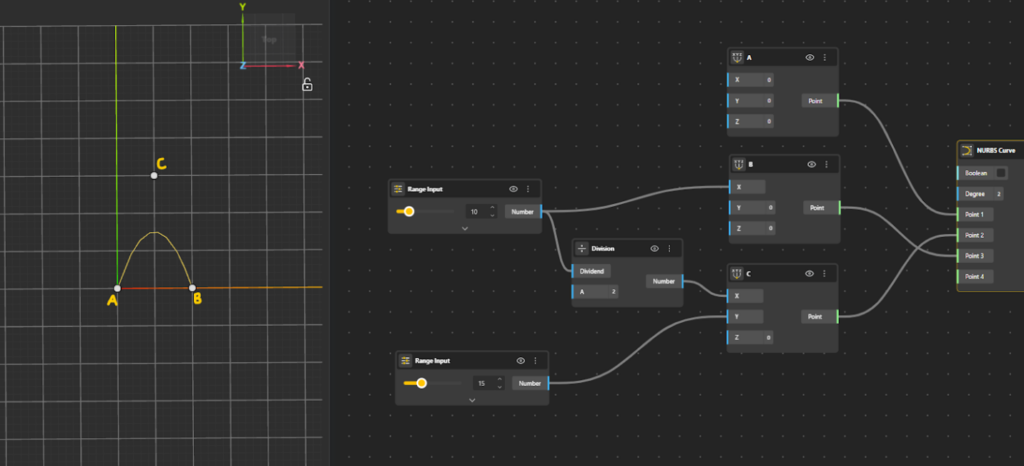 - Add a NURBS Curve component to the canvas. Define the curve to smoothly pass smoothly through A → C → B.