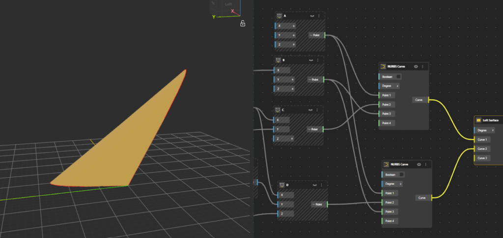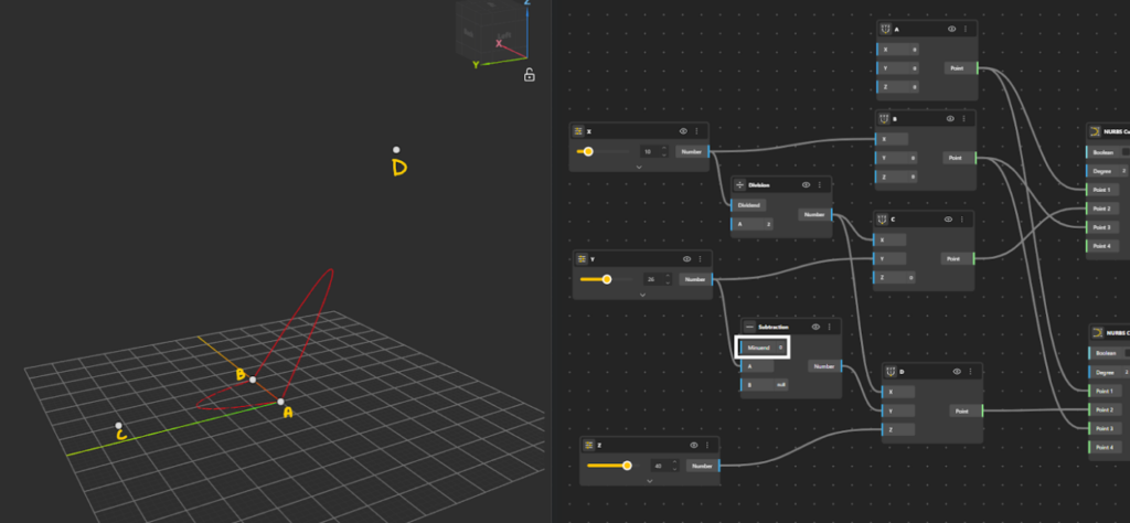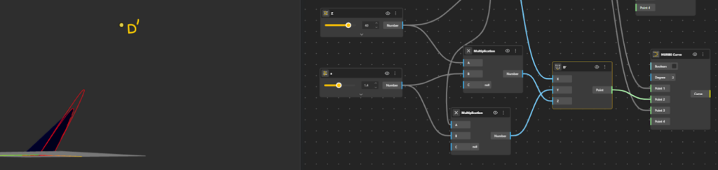 - Add NURBS Curve component to the canvas. The second curve is now defined, passing through A → D’ → B, forming a spatial (3D) curve.