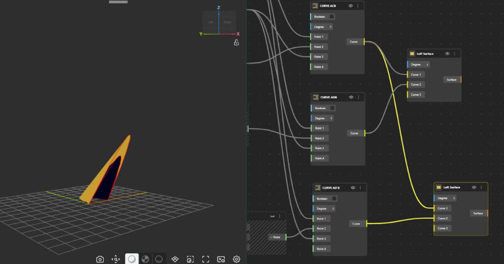 - Add a Loft surface component to the canvas. Connect both NURBS curves as inputs to the Loft node. The Loft component generates a surface by smoothly interpolating between the two curves along their length.