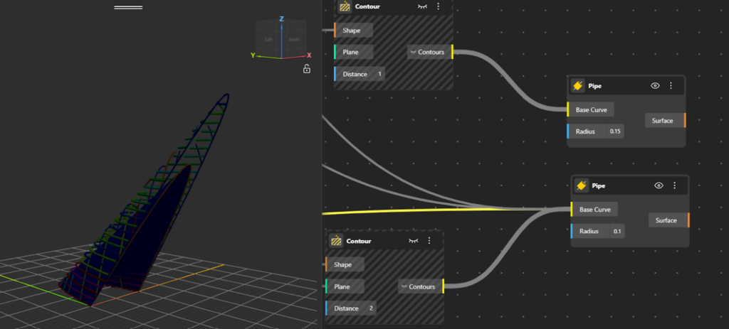 - Connect the contour curves to the Pipe node and set the radius appropriately to give thickness.