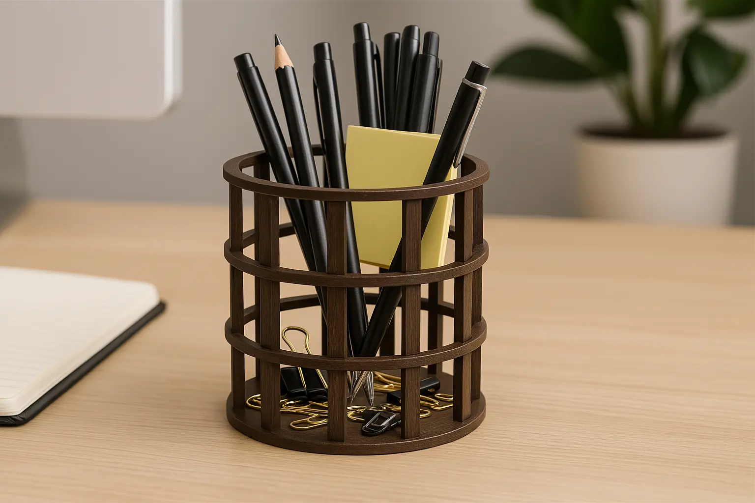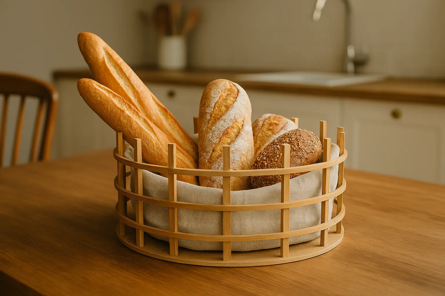A basket is a container typically made from natural materials. It is characterized by its open, often woven structure, with a base and sides that form a hollow shape capable of holding and carrying objects.