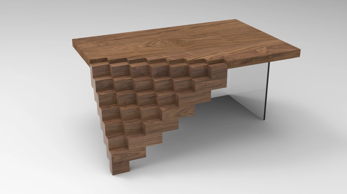 This table, with its intriguing design that seems to blend a conventional flat surface with a complex, geometrically intriguing base, could aptly be named "The Cascading Cubes Table." This name highlights the distinctive feature of the table, where the pattern on one side appears like a series of cubes gradually descending or melting away from the solid surface.