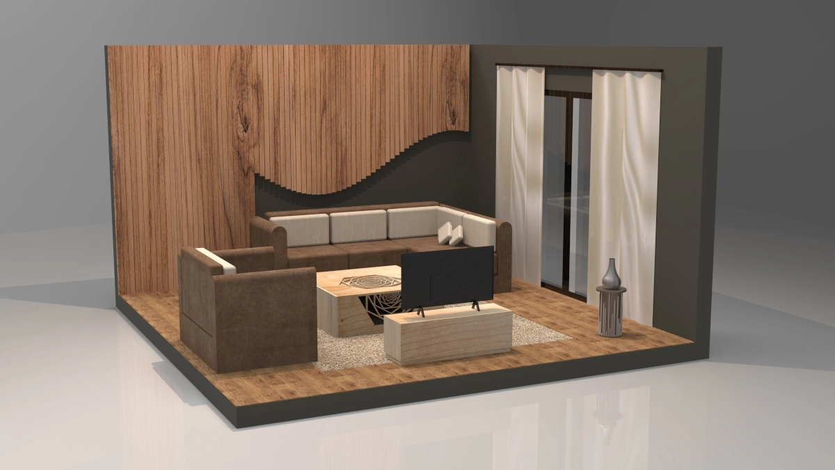 This modern living room with a U-shaped sectional sofa, facing a TV on a low stand. Behind the sofa is a textured wall with vertical slats. A door is covered with light grey curtains, and a tall decorative vase sits on the floor near the door. The overall design reflects a clean and cohesive style, with a neutral color palette and a focus on simplicity and modernity.