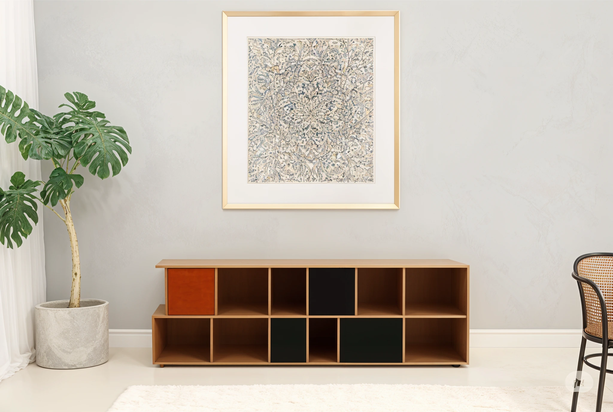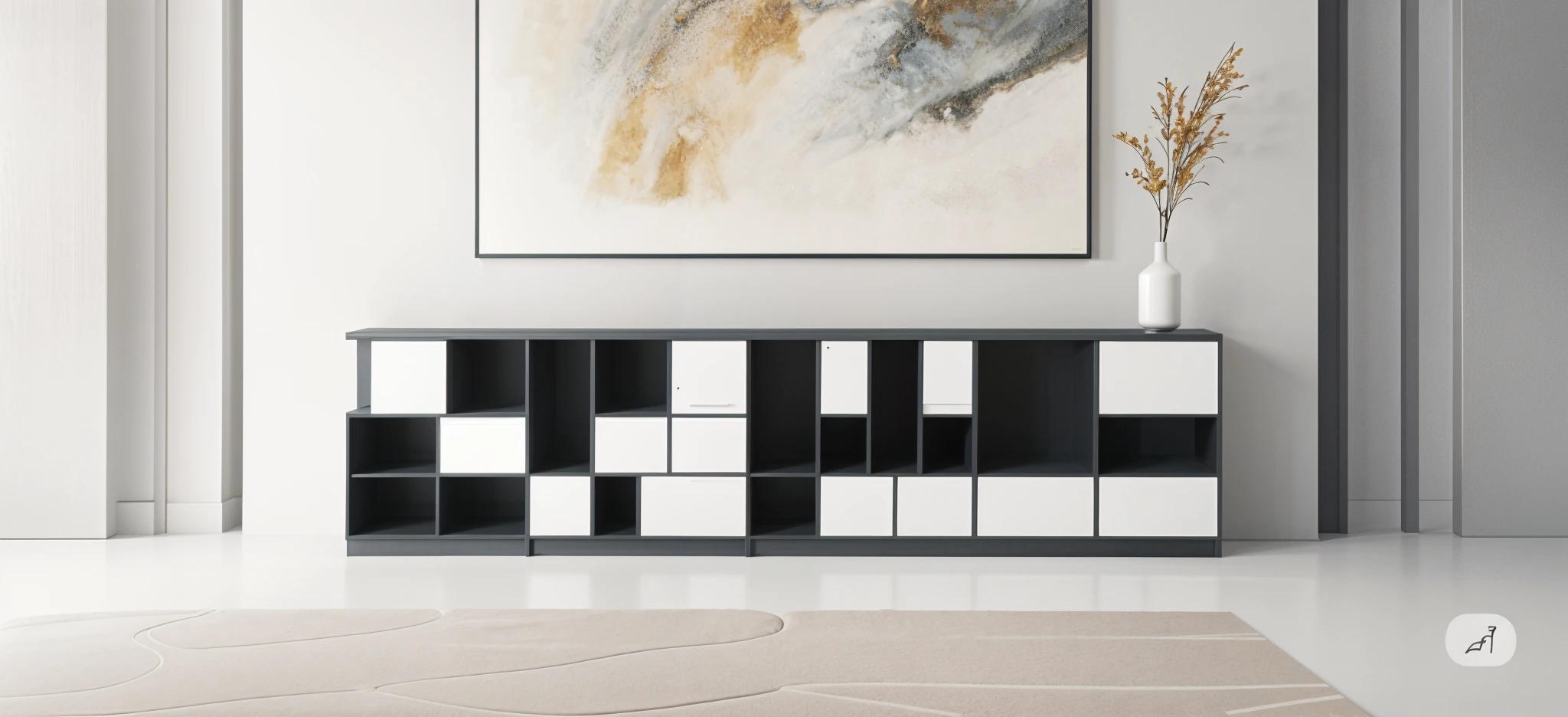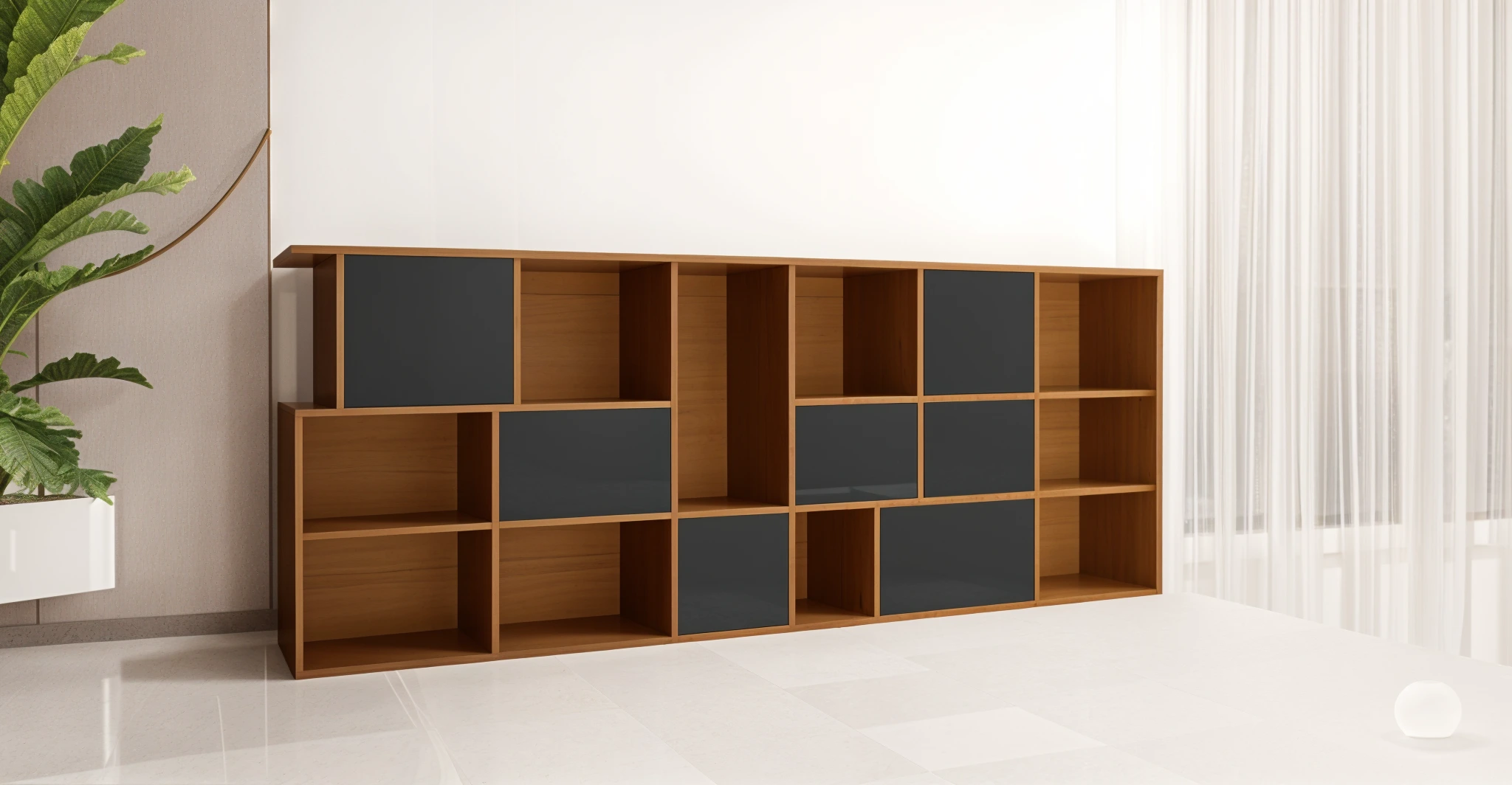 A sleek, contemporary modular storage unit crafted from warm-toned wood with a mix of open compartments and minimalist white-panel doors. The alternating pattern of open and closed sections creates a visually engaging layout that balances functionality with modern design. Ideal for organizing books, décor, or everyday items, this versatile piece fits seamlessly into living spaces, offices, or creative studios.